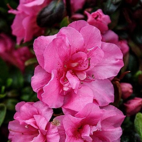 Азалия японская Розалинд - невысокий, полувечнозелёный кустарник до 0,5м в высоту, при диаметре 1м. Растёт медленно. Цветы крупные (около 10 см в диаметре), ярко-розовые. Форма цветка колокольчатая. Листья маленькие, продолговатые, ярко-зелёного цвета.