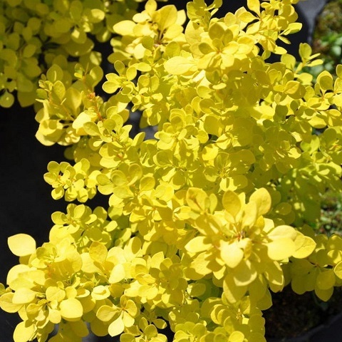 Барбарис тунберга Голден Горизонт- Невысокий, медленнорастущий кустарник с приземистой слабораскидистой кроной, растёт горизонтально. Высота — до 70 см, диаметр — до 100 см. Листья овальной формы, небольшие и текстурные. Весной они приобретают жёлто-зелёную окраску, летом становятся ярко-жёлтыми, осенью листва меняет цвет на оранжевый. Цветки небольшие, бело-жёлтые. Цветение — в мае. Плоды продолговатые, красные. Созревают в сентябре.
