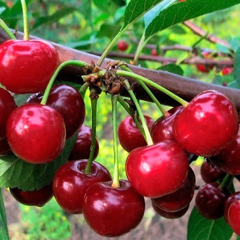 Плоды: очень крупные (до 8 г), тёмно-красные, плоскоокруглой формы. Мякоть нежная, но плотная, темно-красная, сочная, сладкая с лёгкой кислинкой. Сок красный. Внутри крупная косточка, которая легко отделяется.