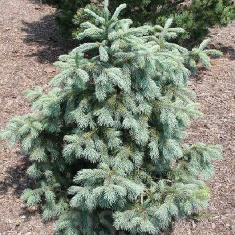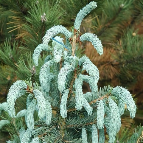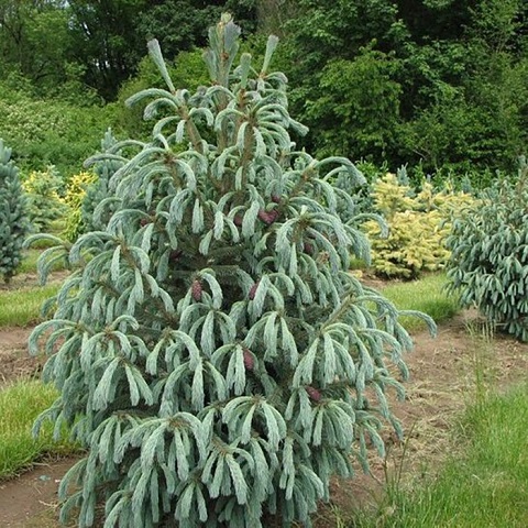 Форма кроны: пирамидальная, плотная, с немного поникающими ветвями, что придаёт ели плакучий вид.