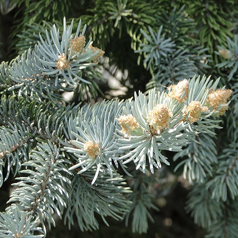 Хвоя: жёсткая, колючая, среднего размера, сине-зелёной окраски. Шишки коричневые, расположены на концах ветвей.
