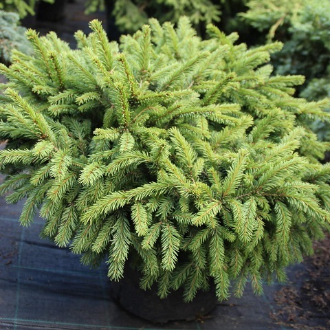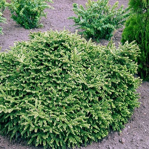 Не высокий сорт ели обыкновенной в молодом возрасте шаровидной формы, затем раскидистый. Хвоя голубоватого оттенка, сизая, короткая до 1 см длиной, плотная, жесткая. Растет медленно 3-4 см в высоту, 5-6 см в длину. В возрасте 10 лет в высоту 1 м, в ширину 2 м. Во взрослом состоянии высота 1 м, диаметр 3 м.
