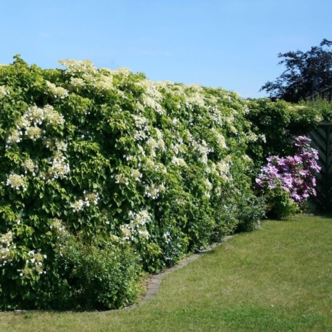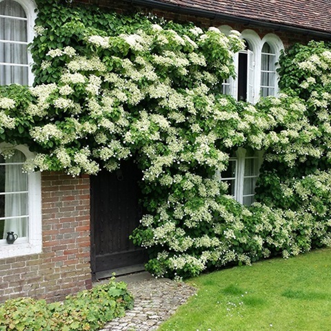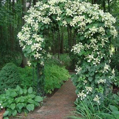 Использование в ландшафтном дизайне: Чаще всего используют при декорировании беседок, арок, фасадов зданий, каменных стен, высоких заборов. Нередко высаживают рядом с крупными деревьями, стволы которых впоследствии обвивает эта вьющаяся гортензия. При отсутствии опоры стелется по земле, поэтому может использоваться и в качестве почвопокровного растения.