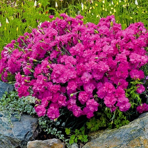 Описание: многолетнее травянистое растение высотой 25-35 см. Образуется компактный округлый кустик. Листья: продолговатые, узкие, серовато-зеленого оттенка. Цветы: небольшие (около 3 см), махровые, состоят из 5 лепестков, края которых имеют зубчатую форму, как и у других растений из семейства гвоздичных. Окраска разнообразная. Цветение продолжается с середины июня по октябрь. После завершения процесса цветения на месте цветка формируется коробочка с семенами.