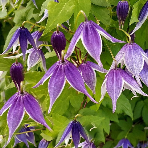 Цветки: диаметром 5–7 см, форма — колокол. Окраска чашелистиков — синяя с фиолетовым напылением, по краям «лепестков» — выразительная белая кайма. На внутренней стороне цветка расположены стаминодии салатового цвета, обратная сторона чашелистиков более светлая.