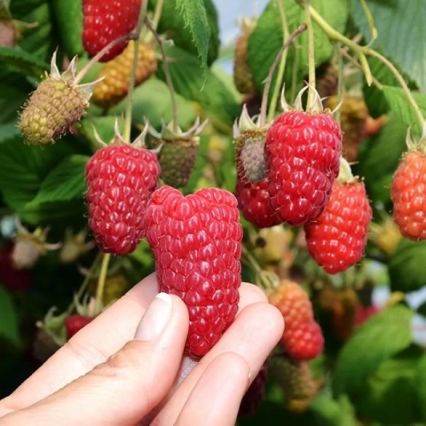 Ягоды: Ягоды цилиндрической и тупоконической формы, крупные. Средняя масса плодов — 9,7 граммов, длина 3–5 см. В каждом урожае встречаются и более крупные экземпляры, весом 12–14 г. Кожица спелой малины интенсивно красного окраса, крепкая, эластичная. Мякоть — мясистая, ароматная. Вкус — нежный, десертный.