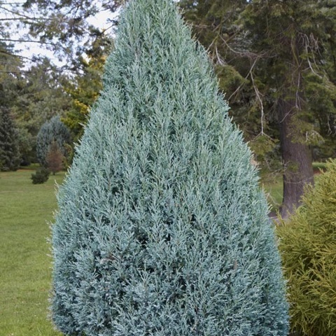 Можжевельник скальный Моффет Блю - колоновидный сорт можжевельника с широкой кеглевидноя кроной. С возрастом крона равномерно округляется. Побеги и ветви расположены вертикально и прижаты к стволу. Хвоя чешуйчатая, мелкая, густая, зеленого цвета с серебристо-голубым оттенком. Прирост за год 20-30 см. В 10 лет достигает высоты 2,5-3 м и ширины 0,8 м.