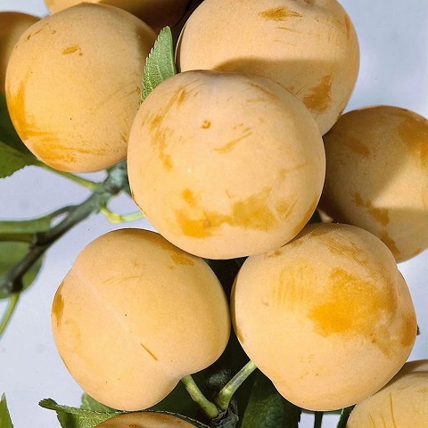 Плоды: крупные, круглой формы, весом до 50 грамм, жёлтые. Кожица плотная, с восковым налётом, мякоть сладкая, сочная и ароматная. Косточка небольшая, не полностью отделяется от мякоти. Вкус — лёгкий медовый с небольшой кислинкой.