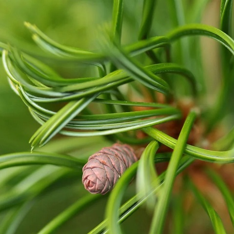 Хвоя: длиной до 12 см, густая, мягкая, изогнутая, голубовато-зелёная. Шишки узкие, цилиндрические, длиной до 2–3 см, смолистые, светло-коричневые, образуются после достижения растением возраста 2–3 лет