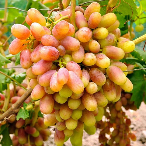 Ягоды: Форма удлиненная, сосковидная, цвет розовый. Вес плода около 20 г. Содержание сахара составляет 28%. Полупрозрачные ягоды могут отдавать легкой желтизной. Под тонкой, но прочной кожицей от 3-х до 5 косточек в плотной мякоти. Виноградная оболочка предохраняет спелые виноградины от растрескивания и атак ос. При перегрузке лозы период созревания затягивается от 10 до 20 дней. Чем дольше период нахождения грозди на кусте, тем это полезнее для качества плодов. Ягоды нежные, сладкие, без оттенка горечи. В гармоничном вкусе не ощущается терпкости. Имеются легкие мускатные нотки и яркое послевкусие с оттенками земляники.