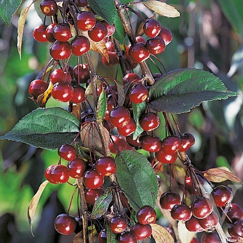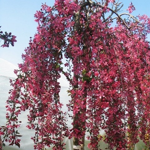 Описание: Дерево с плакучей формой кроны. Высота определяется высотой штамба. Диаметр кроны 1-2 м. Годовой прирост 20-25 см. Листья зелено-пурпурные, при распускании - бронзово-красные, осенью - оранжево-коричневые. Цветение приходится на май. Бутоны пурпурно-красные, из которых появляются небольшие (около 5 см) тёмно-розовые цветки. Плоды тёмно-красные, мелкие, созревают в первой декаде сентября.