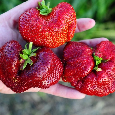 Ягоды: гребенчатой формы, очень крупные. Средний вес плодов — 50–80 г, максимальный — 90–110 г, отдельные ягоды могут достигать 150 г. К концу сезона клубника мельчает. Цвет спелой земляники насыщенно-красный. Вкус — сладкий, сахарный без кислинки.